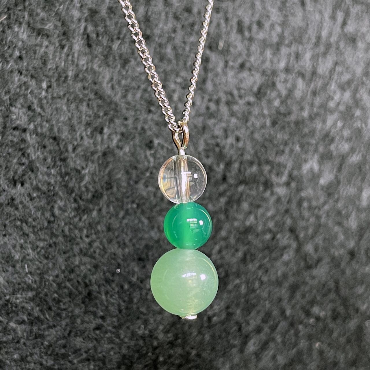 プレナイト8mm玉、 グリーンアベンチュリン6mm玉 水晶6mm玉 を使ったペンダントです サイズ;トップー20mm チェーン40cm チェーンの色シルバー